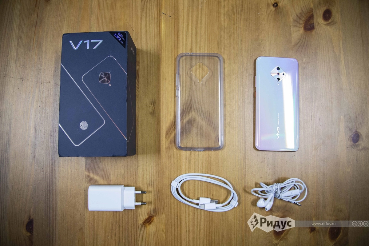 Vivo V17 поставляется в синей коробке из плотного картона. В комплекте идет зарядное устройство, кабель USB Type-C на USB-A, гарнитура руководство пользователя. Также вместе со смартфоном поставляется защитный чехол, что является большим плюсом. Чехол обычный из силикона, он вполне подойдет на первое время. Из коробки на смартфон уже наклеена заводская защитная пленка.