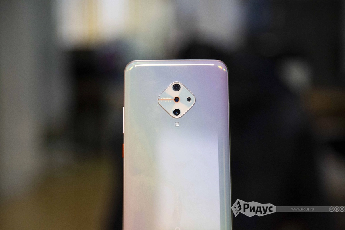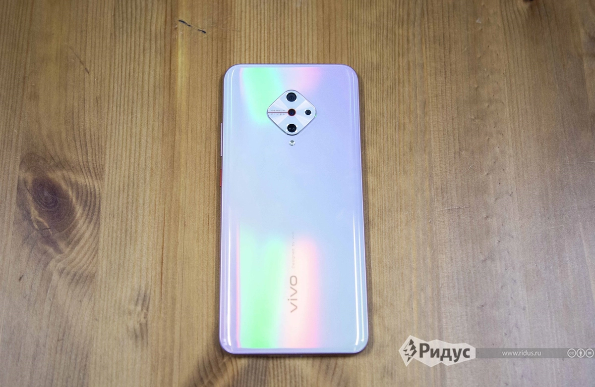 Дизайн смартфона радует. У Vivo получилось сделать девайс очень красивым и самобытным. У нас на тесте перламутровая версия смартфона. Тыльная сторона имеет градиентный окрас, который переходит из светло-розового в белый и светло-сиреневый. На свету и под прямыми солнечными лучами корпус красиво переливается.