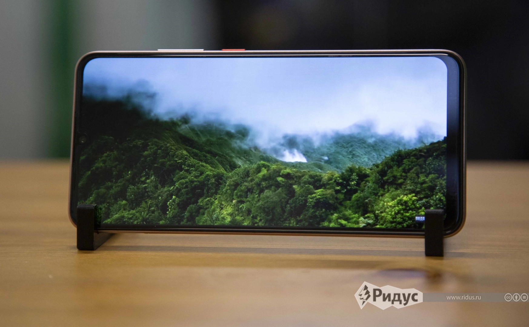 Фронтальная панель имеет практически полностью безрамочный экран. По трем сторонам у дисплея действительно очень тонкие рамки, снизу имеется небольшой подбородок. Фронтальная камера вписана в каплевидный вырез, как и у большинства смартфонов на рынке.