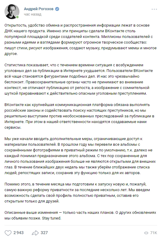 Исполнительный директор социальной сети «ВКонтакте» Андрей Рогозов анонсировал грядущие изменения, которые ожидают ресурс в ближайшем будущем. Их основная цель будет заключаться в защите пользователей платформы от «необоснованных преследований за публикации в интернете», сообщил топ-менеджер на своей персональной странице в соцсети.