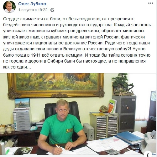 Нужно было тогда в 1941 всё отдать немцам. И тогда бы тайга сегодня точно не горела и дороги в Сибири были бы настоящие, а не направления как сегодня… — написал Зубков в пятницу вечером на своей странице в Facebook.