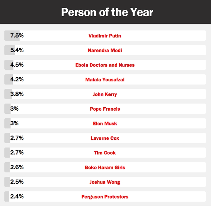 Редакция журнала Time предложила читателям поучаствовать в процессе выбора «Человека года» и отдать свой голос за того человека, который, по их мнению, больше всего повлиял на мировые события в этом году.