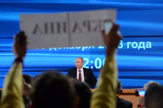Президент России Владимир Путин (слева) и журналисты на большой ежегодной пресс-конференции. © Алексей Филиппов/РИА Новости