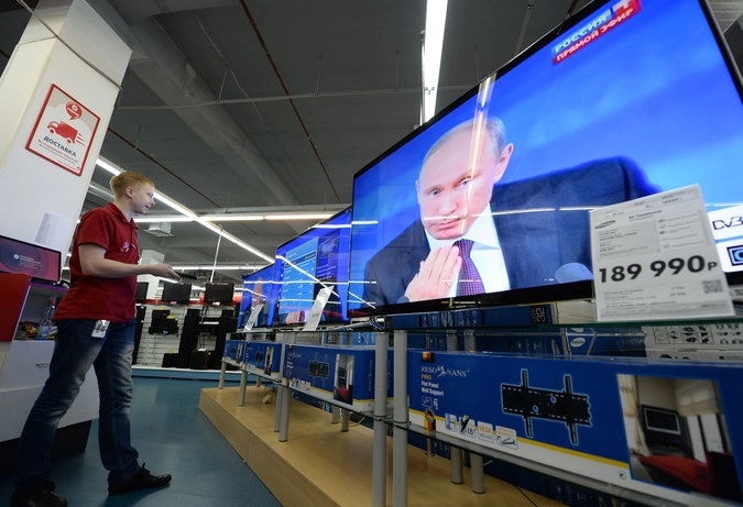Сотрудник магазина "М-видео" в Екатеринбурге смотрит телетрансляцию большой пресс-конференции президента России Владимира Путина. © Павел Лисицын/РИА Новости