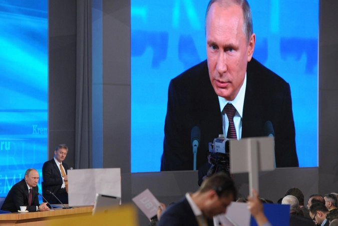 Президент России Владимир Путин (слева) отвечает на вопросы журналистов на большой ежегодной пресс-конференции. © Алексей Никольский/РИА Новости