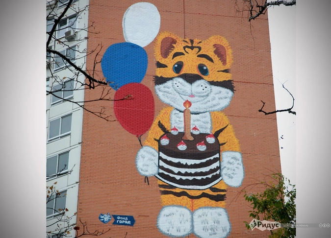 Молодые художники из фонда поддержки гражданских инициатив «ГОРОД» нарисовали тигренка по имени Мур, нового персонажа передачи «Спокойной ночи, малыши!», на одном из домов по Амурской улице в Москве. На рисунке тигренок держит в лапах праздничный торт и воздушные шарики, поздравляя с днем рождения главу государства, который и подсказал идею нового персонажа детской телепередачи.