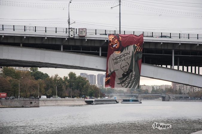 Ранним утром неизвестные активисты вывесили баннер на Большом Краснохолмском мосту в Москве. На баннере был изображен президент США Барак Обама, облаченный в футболку с портретом Владимира Путина.