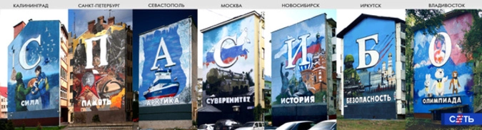 В семи городах России появился ряд граффити-открыток — поздравлений Владимиру Путину. Огромные изображения украсили дома в Москве, Санкт-Петербурге, Новосибирске, Владивостоке, Иркутске, Калининграде и Севастополе. В каждом городе была нарисована своя буква, с которой начинается слово, имеющее символическое значение для нашего поколения. «С» — сила, «П» — память, «А» — Арктика, «С» — суверенитет, «Б» — безопасность, «О» — олимпиада.