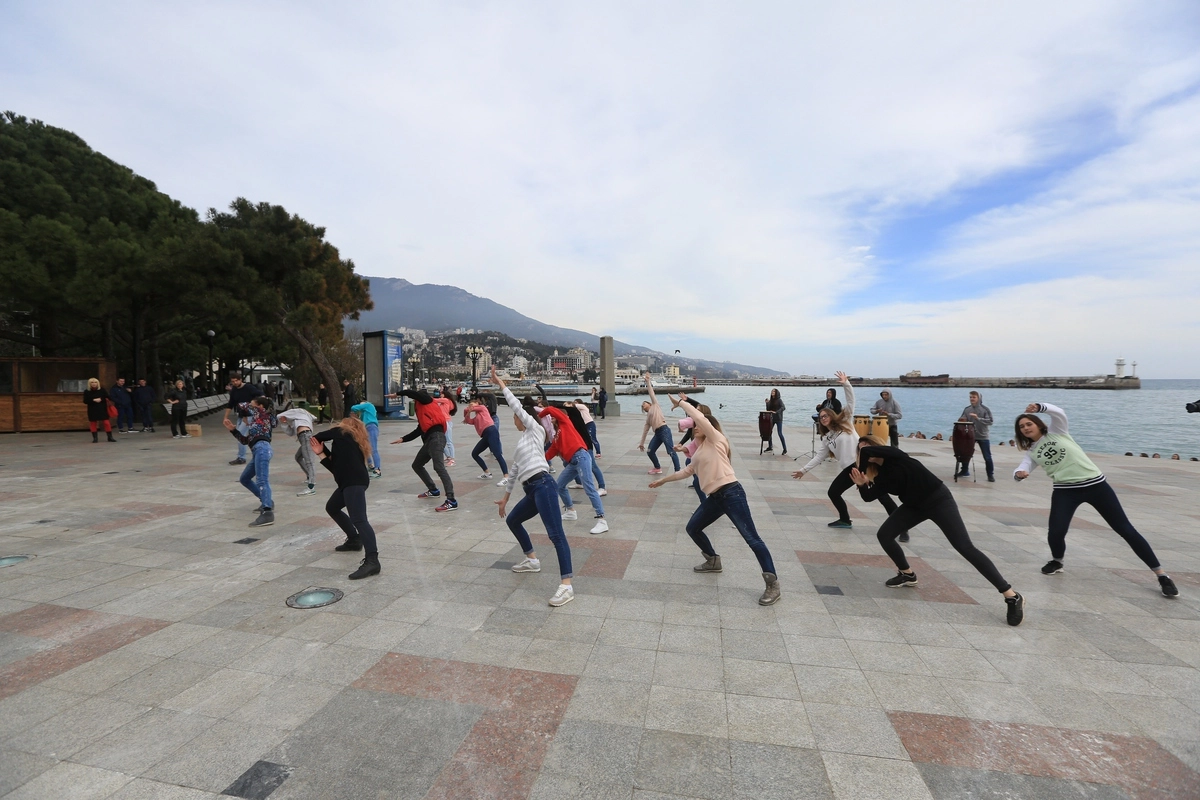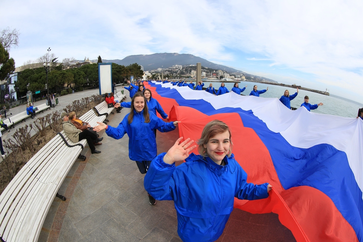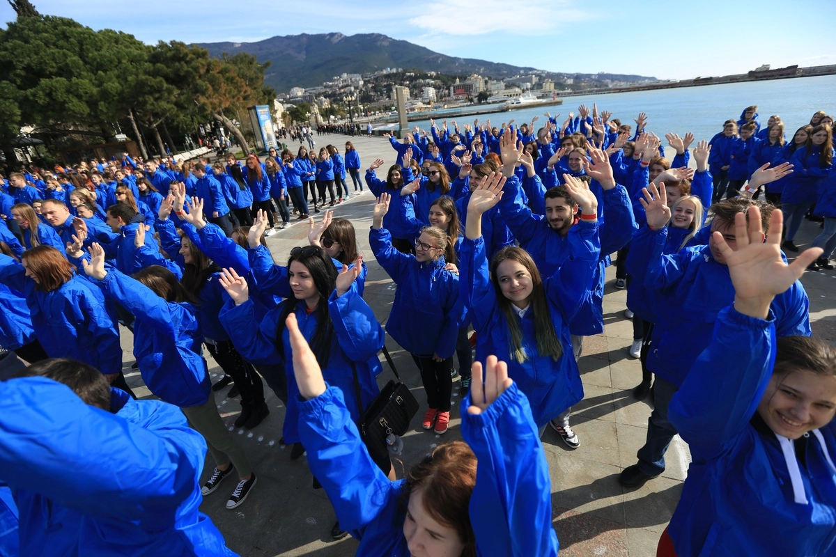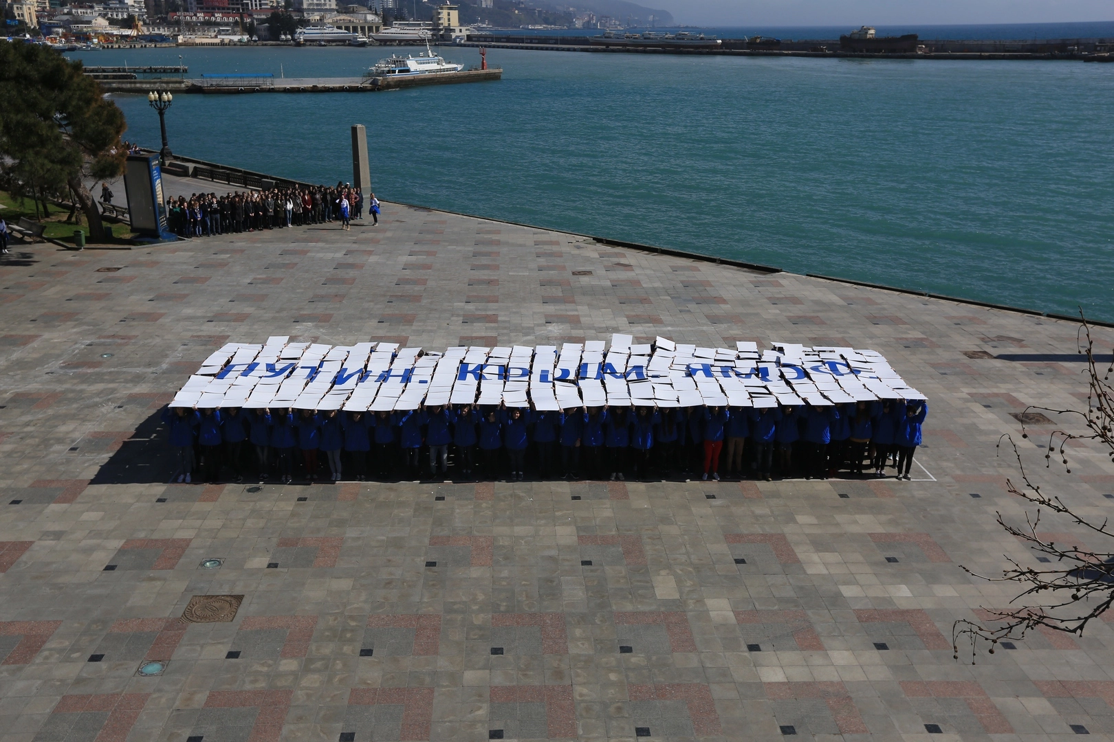 На ялтинской набережной прошел яркий флешмоб, организованный студентами полуострова: около тысячи участников выстроились в форме аббревиатуры Ялтинского международного экономического форума, а также развернули огромный флаг России и подняли таблички, которые сложились в единую картину-надпись «Путин. Крым. ЯМЭФ».