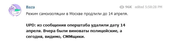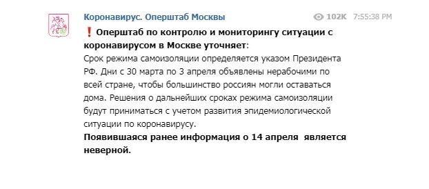 «Режим повышенной готовности введен на территории города Сергеем Собяниным 5 марта 2020 года. Согласно указу мэра Москвы, режим самоизоляции введен для всех жителей столицы независимо от их возраста. Его необходимо соблюдать в ближайшее время с учетом развития эпидемиологической ситуации по коронавирусу. Дни с 30 марта по 3 апреля объявлены нерабочими по всей стране, чтобы большинство россиян могли оставаться дома», — было сказано в подправленном сообщении.