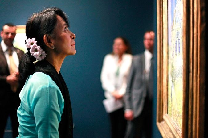 Аун Сан Су Чжи осматривает картины в парижском музее. © Thibault Camus/Reuters