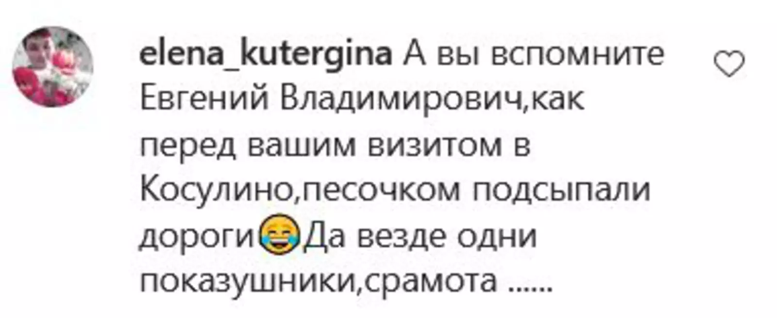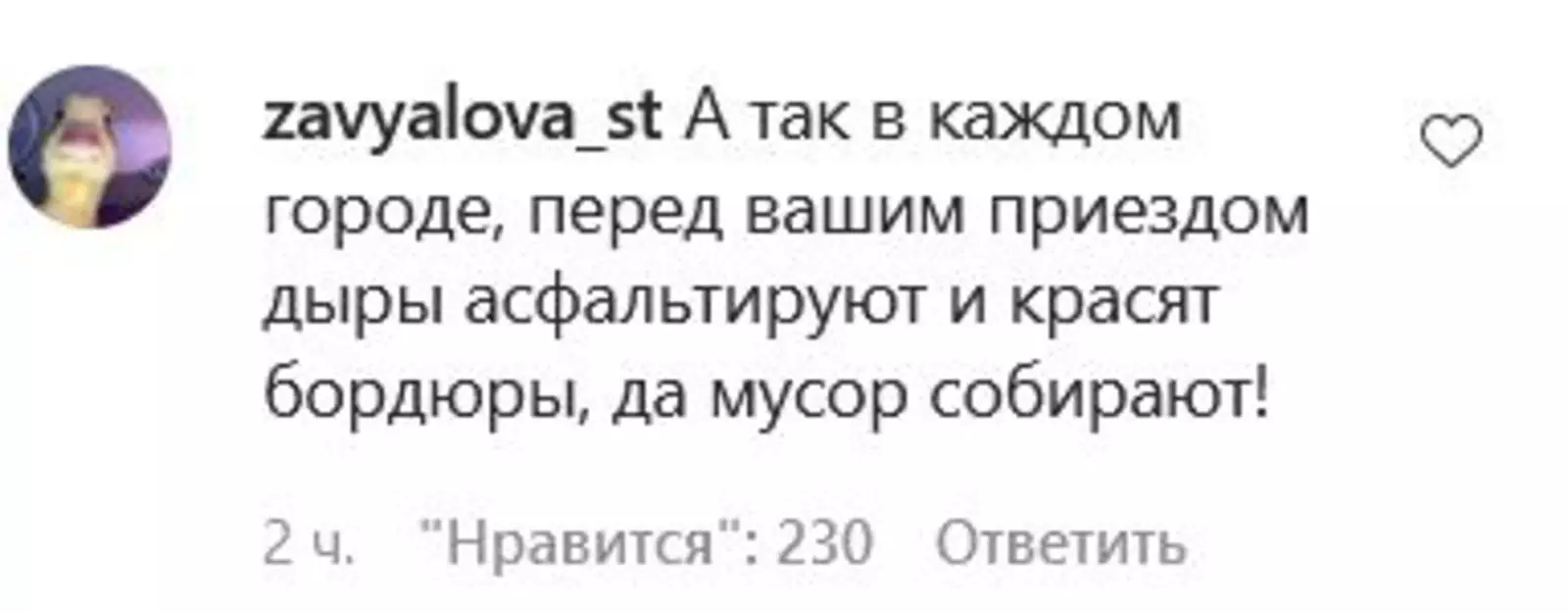 Глава города не ответил губернатору, однако это сделала его пресс-секретарь Дарья Мохова. По ее словам, эту дорогу полили по просьбе местных жителей. Это было сделано «с целью пылеподавления». Также она рассказала, что асфальтирование данного участка не планируется. Дорога числится в реестре как щебёночная, сообщает «Подъем».