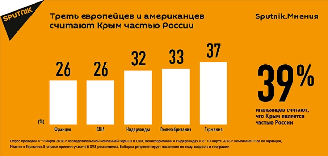 Согласно исследованию, более трети жителей Италии и Германии, треть британцев и голландцев, а также четверть французов и американцев считают, что Крым является частью России. Исследование проводилось по заказу информационного агентства Sputnik: