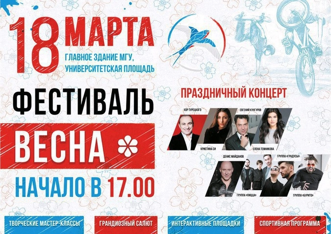 Самые масштабные гулянья намечаются в российской столице. На площади перед главным зданием МГУ пройдет масштабный фестиваль «Весна». На сцену выйдут Сергей Трофимов, Валерия, группа «Любе», Хор Турецкого и прочие звезды отечественной эстрады.