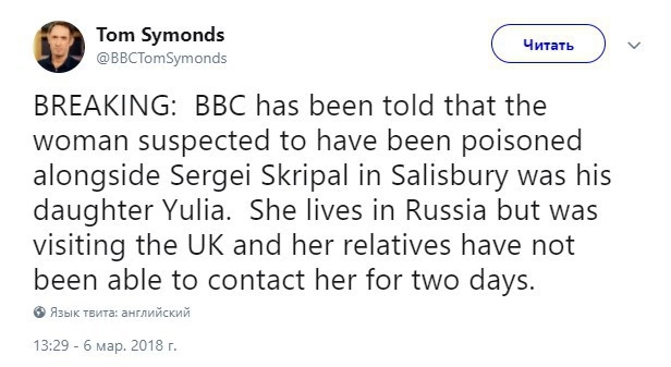 Дочь бывшего полковника Главного разведывательного управления Сергея Скрипаля пострадала от отравления неизвестным веществом вместе с отцом. Об этом написал корреспондент Би-би-си Том Саймондс на своей странице в Twitter.