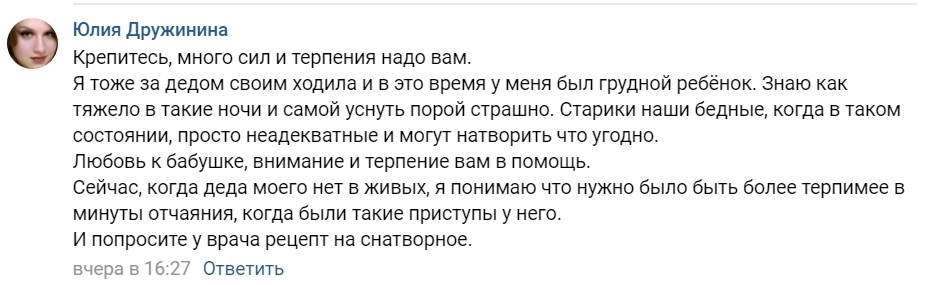 Бабушка сейчас нормально. Удалось успокоить только в девять утра. Пришла соседка, которая была раньше медиком, вколола ей какой-то укол — бабушка тут же уснула. Я считаю, что это могла бы сделать скорая помощь. За эту ночь она несколько раз хваталась за ножи, падала, билась головой о пол. Кричала, звала на помощь. В таких ситуациях я бессильна, — ответила Анастасия.