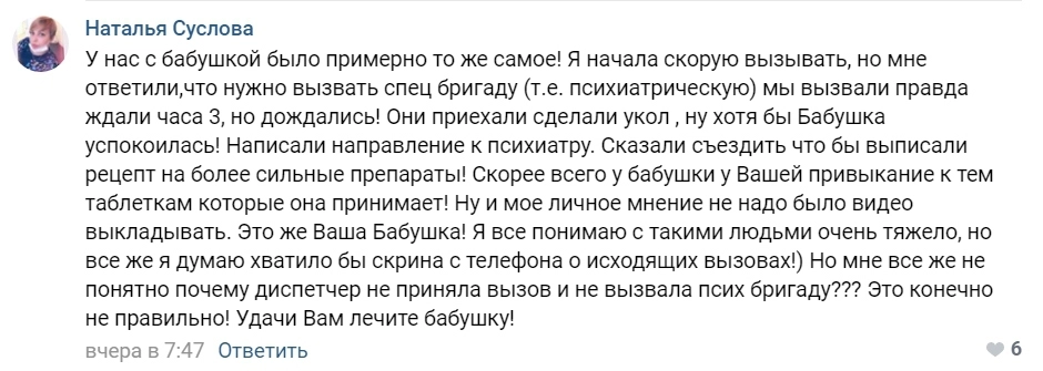 Уже не раз приезжала скорая и ее успокаивала, а в этот раз не приехала. Как диспетчер по телефону оценила тяжесть ситуации, я не понимаю.