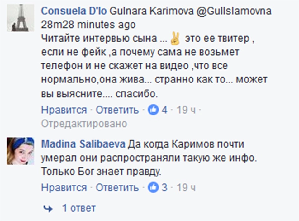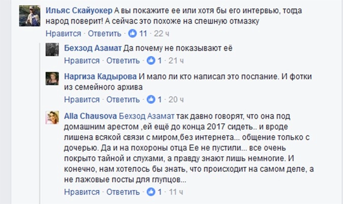 В комментариях под записью на странице в Facebook «Дети Каримова» пользователи потребовали доказать правдивость информации и показать Гульнару.