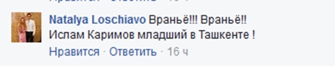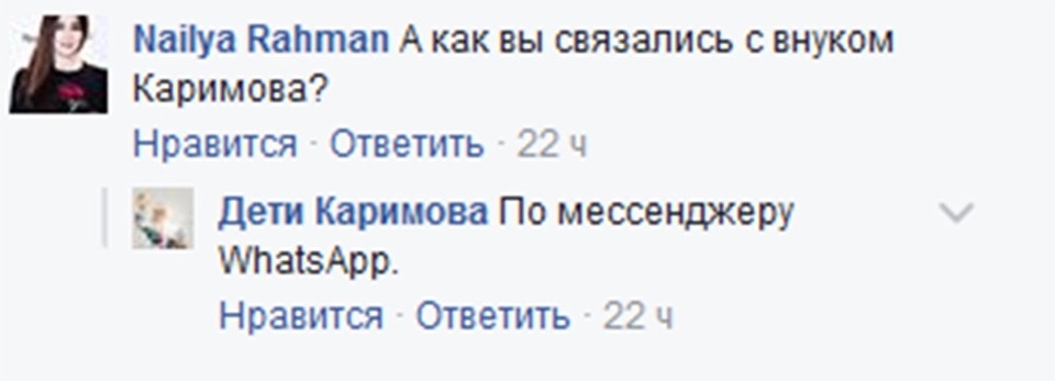 Администраторам группы также был задан вопрос, каким образом удалось получить комментарий от Ислама Каримова, если известно, что тот находится за рубежом и даже на похороны деда, в честь которого и был назван, он не приехал из Лондона.