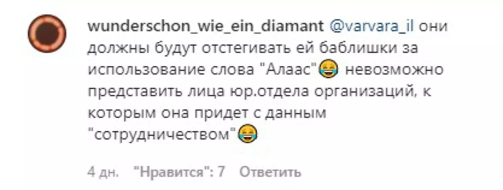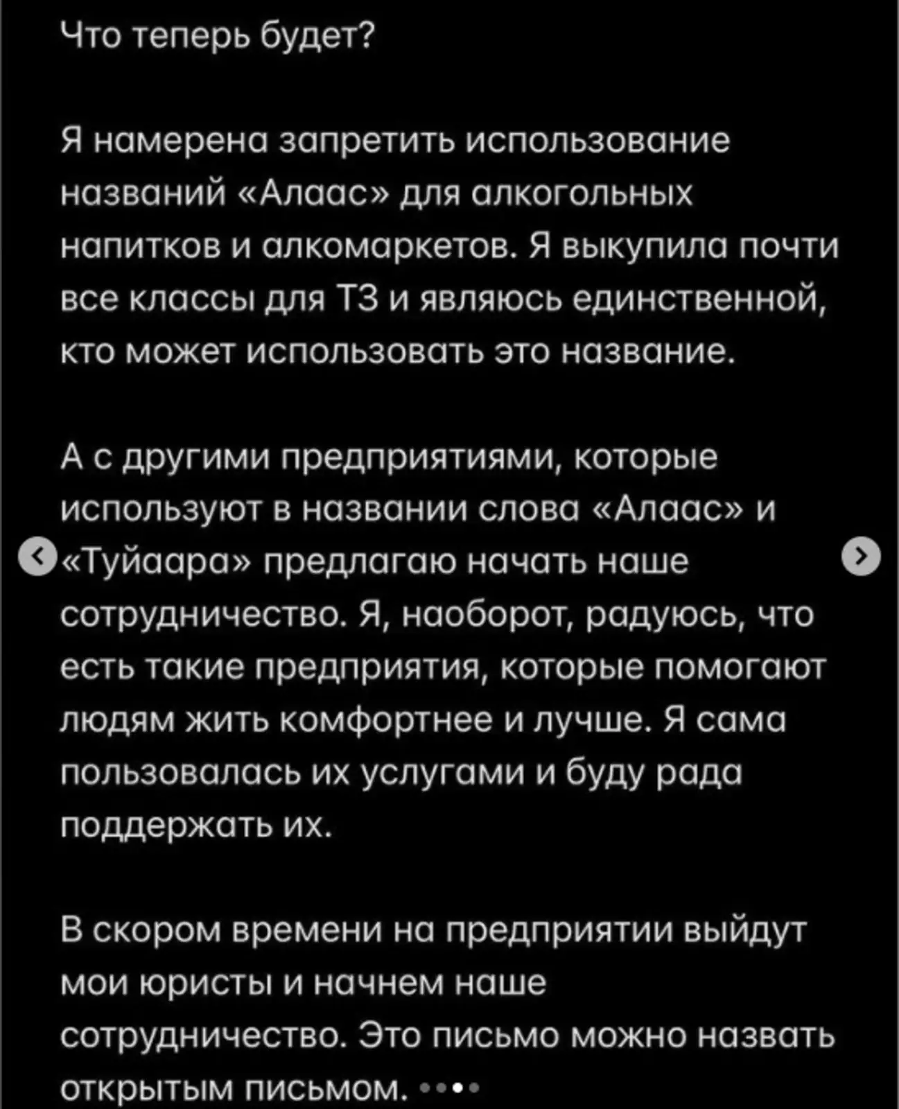 «Я намерена запретить использование названий „Алаас“ для алкогольных напитков и алкомаркетов. Я выкупила почти все классы для ТЗ и являюсь единственной, кто может использовать это название. А с другими предприятиями, которые используют в названии слова „алаас“ и „туйаара“, предлагаю начать наше сотрудничество», — заявила якутская звезда.