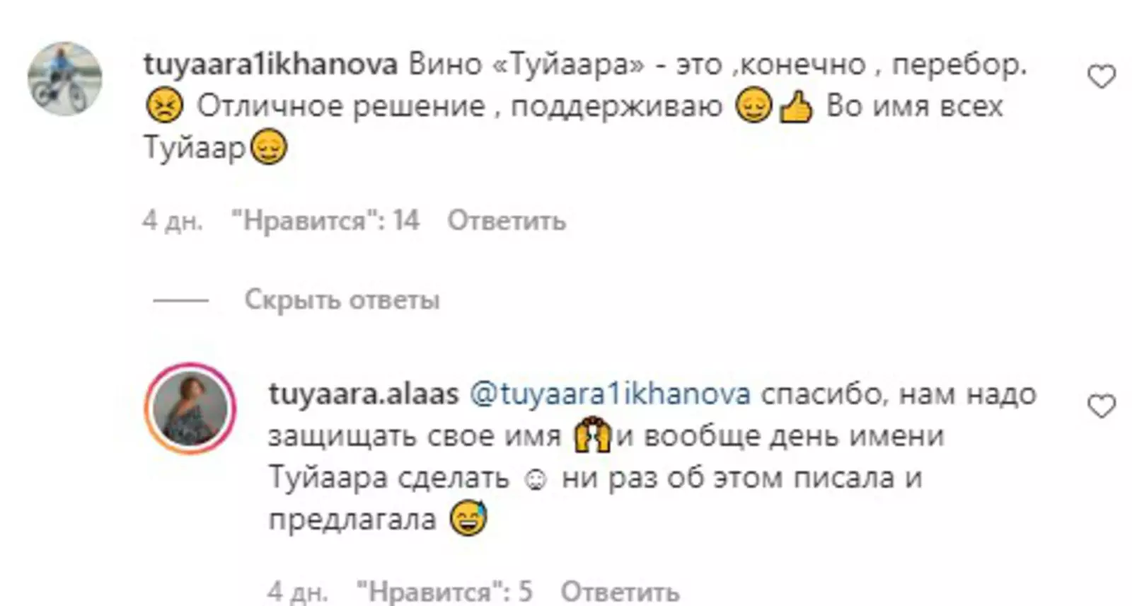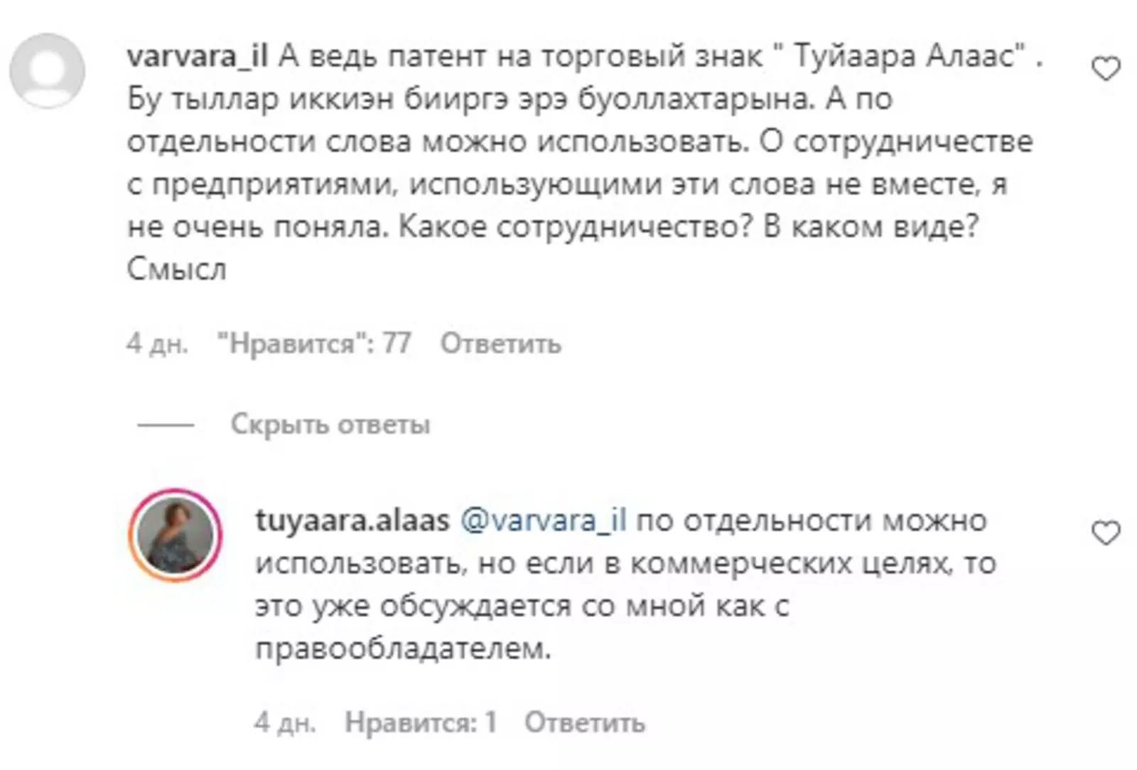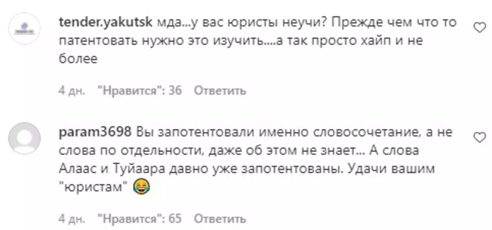 Часть подписчиков в Instagram ведущей, особенно ее тезки Туйаары, поддержали такой шаг. Но большинство отнеслось к нему скептически, полагая, что ее права на знак «Алаас», тогда как она зарегистрировала патент на «Туйаару Алаас», легко будет оспорить. Модель даже обвиняли в дезинформации подписчиков ради хайпа.