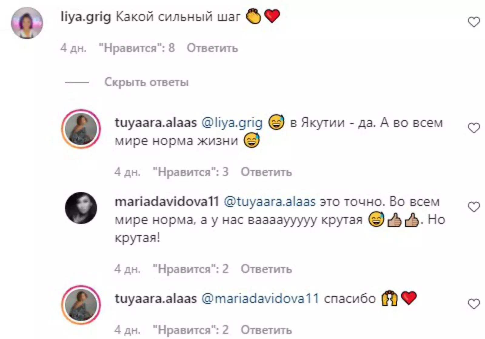 «Мне было очень неприятно слышать и читать про алкомаркет, про водку „Алаас“, про вино „Туйаара“, про разные компании, использующие название „Алаас“, и за людей якобы с псевдонимами „Алаас“, выдающих себя за моих родственников. И за каждый ИХ косяк прилетал камень в мой огород. Однажды даже столкнулась с агрессией, что якобы я специально спаиваю людей и открываю алкомаркеты. Хотя я не имею отношения к ним. И даже за разбитую дорогу, которую делала строительная компания „Алаас“», — рассказала модель.