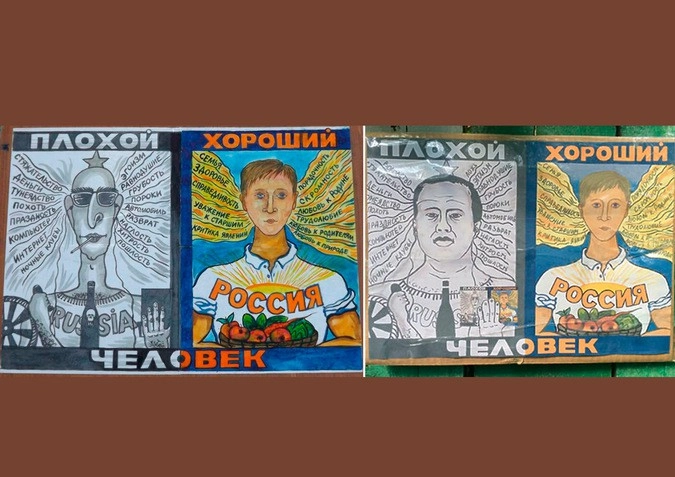 «Хороший» персонаж выглядит так же, как и на оригинале, а «плохой» напоминает соратника блогера Алексея Навального и «подзаборного вора» Георгия Албурова. Он изображен в футболке с надписью «Russia», рядом — бутылка с неким напитком, а вокруг его головы — эдакий нимб из мыслишек о ночных клубах, Интернете, пороках, разврате, деньгах, разумеется, воровстве и так далее.