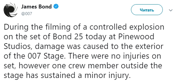 Один человек получил травму в результате контролируемого взрыва на съемках двадцать пятого фильма об агенте 007 Джеймсе Бонде. Об этом сообщается в Twitter киноленты.