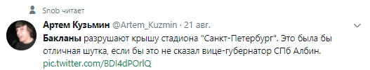 21 августа вице-губернатор Санкт-Петербурга в интервью заявил, что светоотражающую пленку на крыше стадиона «Санкт-Петербург» протыкают клювами бакланы.