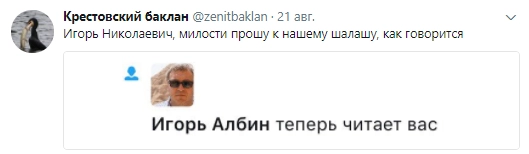 Кстати, сам Игорь Албин уже подписался на Крестовского баклана.