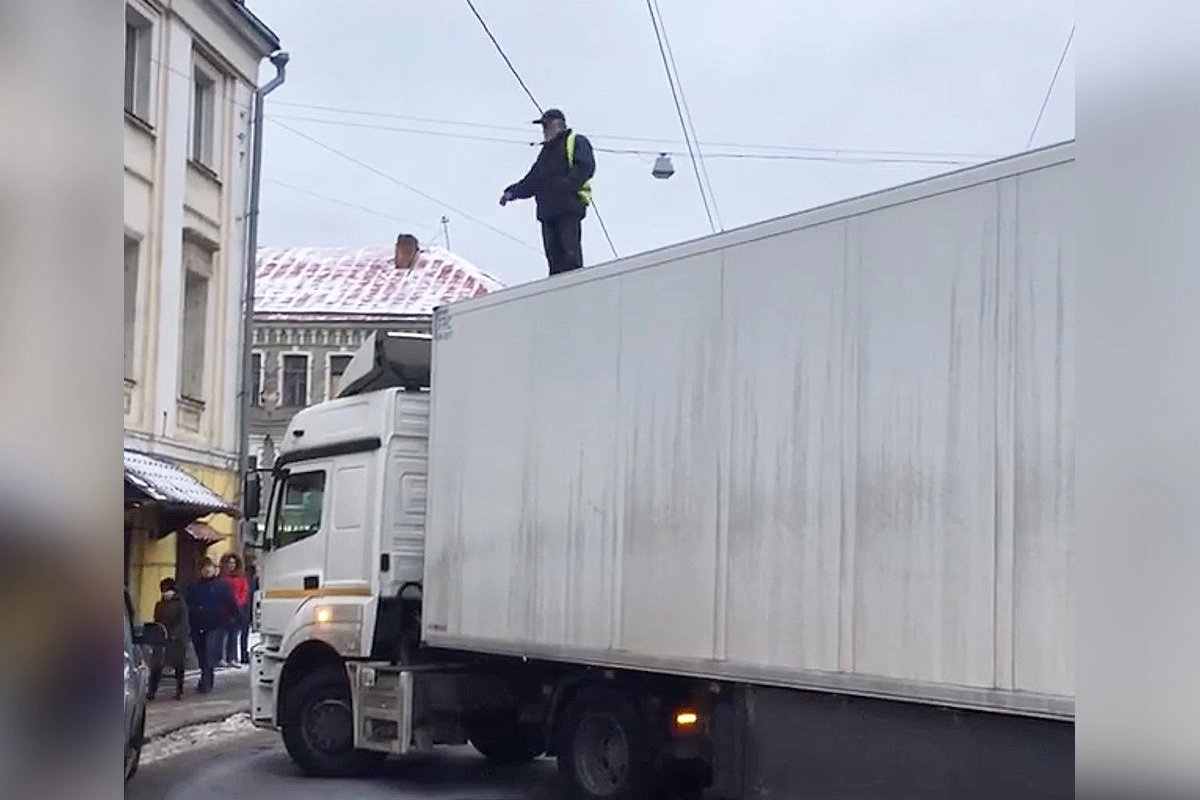 Водитель фуры перекрыл движение на Бауманской улице в Москве и требует выплаты зарплаты, сообщает Baza.