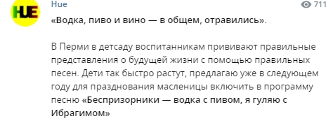 Дело в том, что в детском саду «Гармония» дети веселились на Масленицу под посвященную празднику песню группы «Балаган Лимитед». В ней есть в том числе и строчки о том, как герои отравились алкоголем, выпитым в разных видах и большом количестве: