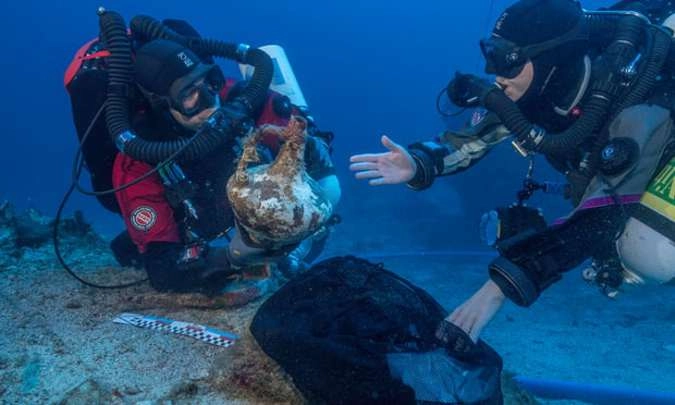 Среди других находок водолазов — узорчатая плита из красного мрамора, серебряная кружка, деревянная рама корабля и человеческая кость, которую еще предстоит идентифицировать.