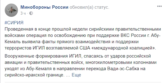 «Проведенная в конце прошлой недели сирийскими правительственными войсками операция по освобождению при поддержке ВКС России г. Абу-Кемаль выявила факты прямого взаимодействия и поддержки террористов ИГИЛ* возглавляемой США „международной коалицией“. Вооруженные формирования ИГИЛ*, спасаясь от ударов российской авиации и правительственных войск, многокилометровыми колоннами уходят из Абу-Кемаля в направлении перехода Вади-эс-Сабха на сирийско-иракской границе», — говорится в сообщении.