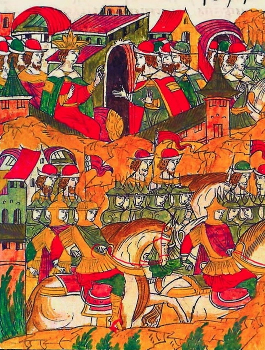 Возвращение Ивана Грозного в Москву и чествование воинов-участников похода. Миниатюра из Лицевого свода, том 22