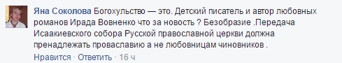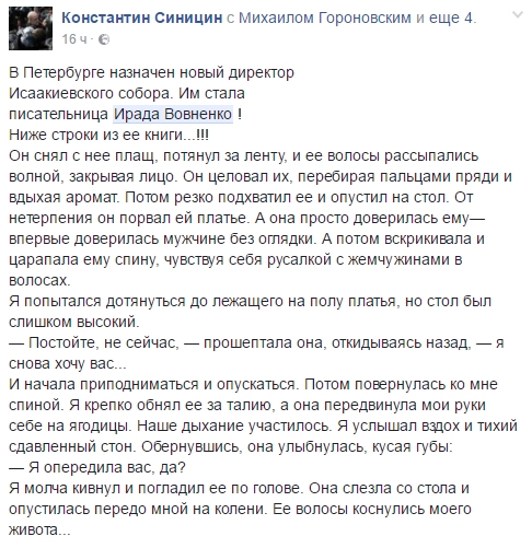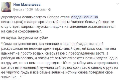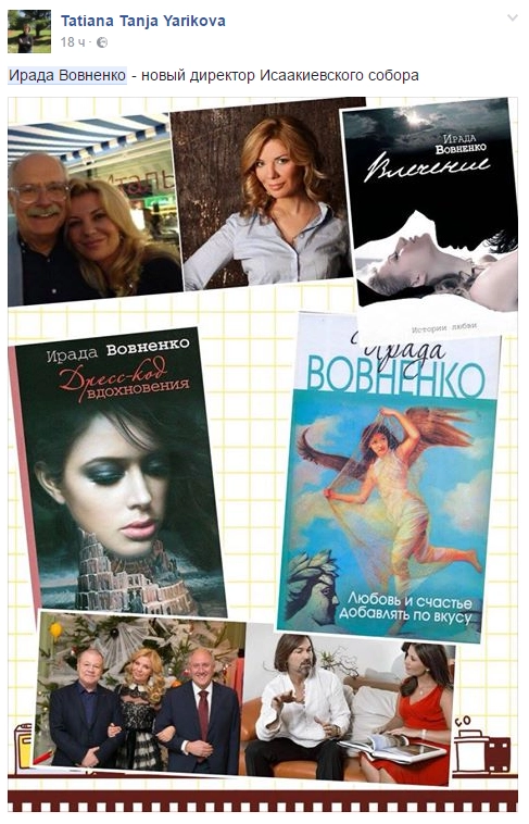 Причин, из-за которых Ирада Вовненко продержалась в новой должности только один день, официально никто не называет. Но у СМИ есть версия, что это может быть связано с её творчеством. Первые сообщения о новом директоре Исаакия сопровождались уточнениями, что Ирада Вовненко пишет книги для детей. Позднее пользователи соцсетей, а вслед за ними и журналисты открыли неожиданную сторону ее литературного таланта: Ирада оказалась автором женских эротических романов. Тех самых, где у героев «темнеют от страсти глаза» и все такое.