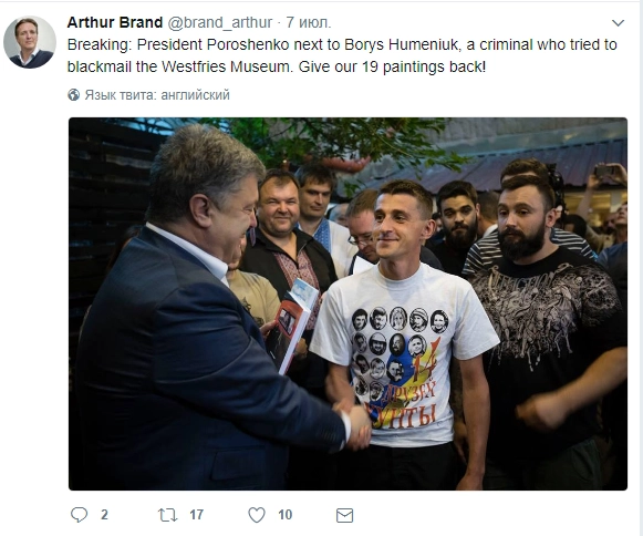 В Нидерландах считают, что украинские власти способствовали вымогателям. Сыщик заявил, что Порошенко лично прикрывал факты мародерства, и потребовал от президента вернуть 19 картин, что «улучшило бы репутацию вашей прекрасной страны».