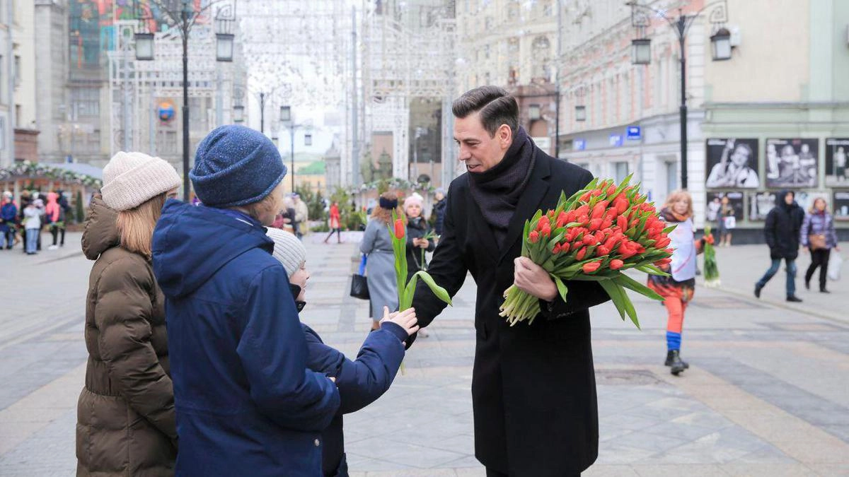 В столице России к добровольцам присоединились известные актеры: на станции метро Фрунзенская москвичек поздравлял актер театра и кино Вячеслав Манучаров, а в Камергерском переулке цветы женщинам вручали актеры МХТ Дмитрий Дюжев, Михаил Трухин и Станислав Дужников.