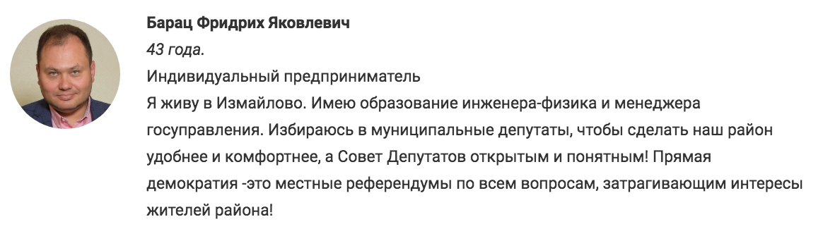 Накануне вокруг одного из «людей Каца» разгорелся скандал. Речь идет о бизнесмене из Тольятти Фридрихе Бараце. Предприниматель присоединился к «Яблоку» еще во времена проекта «Объединенные демократы» Каца и экс-парламентария Дмитрия Гудкова, на муниципальных выборах 2018 года он шел от «Яблока» в Измайлове — и стал мундепом.