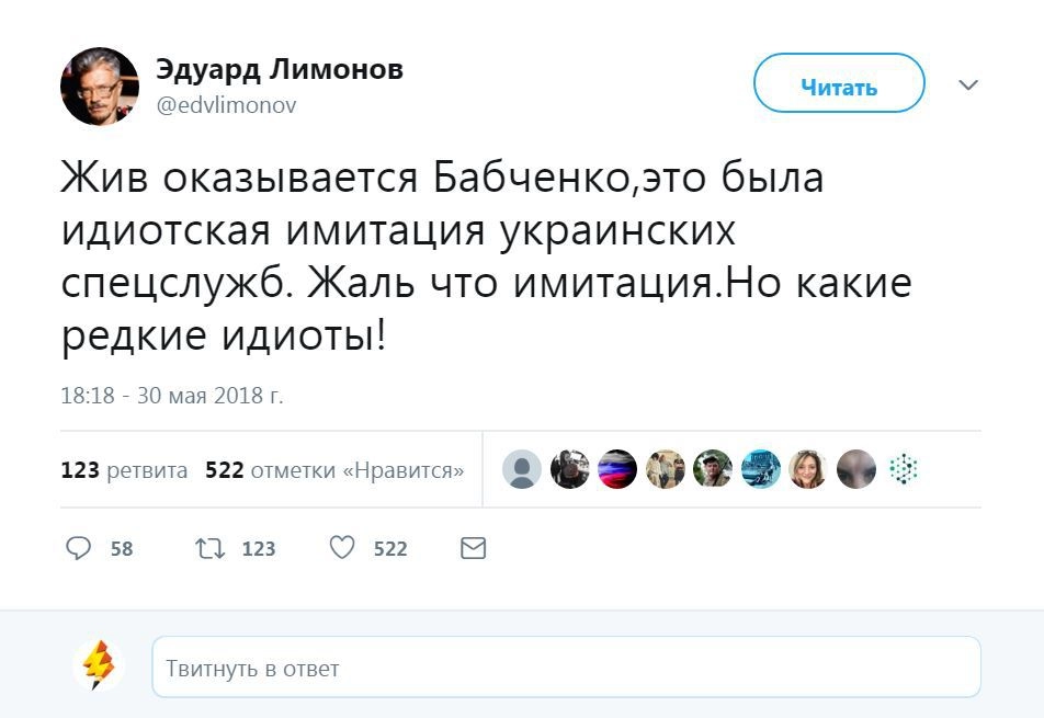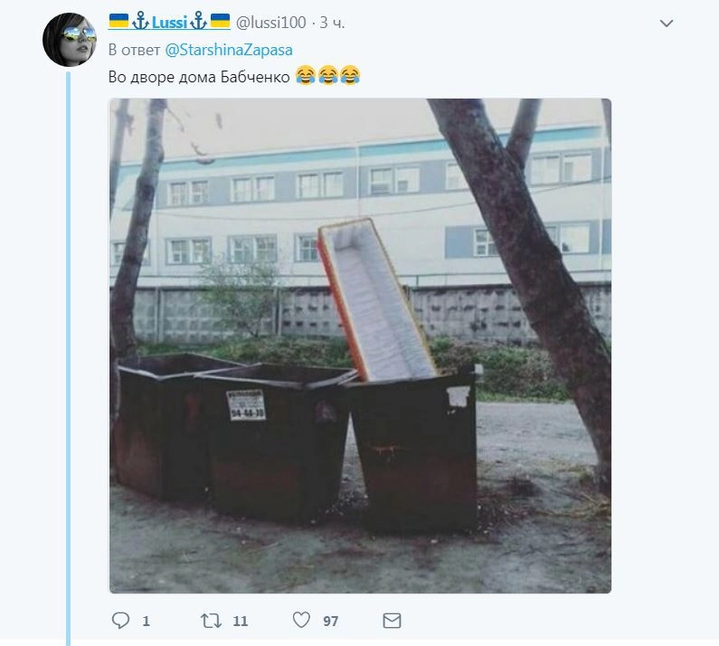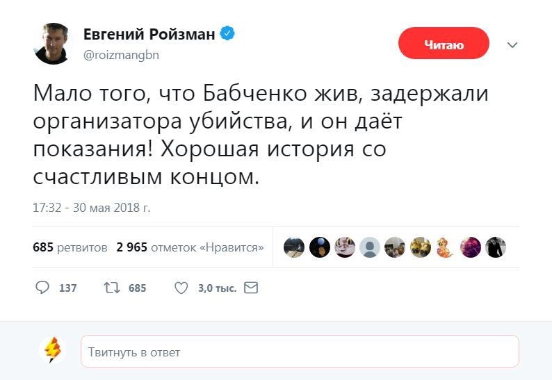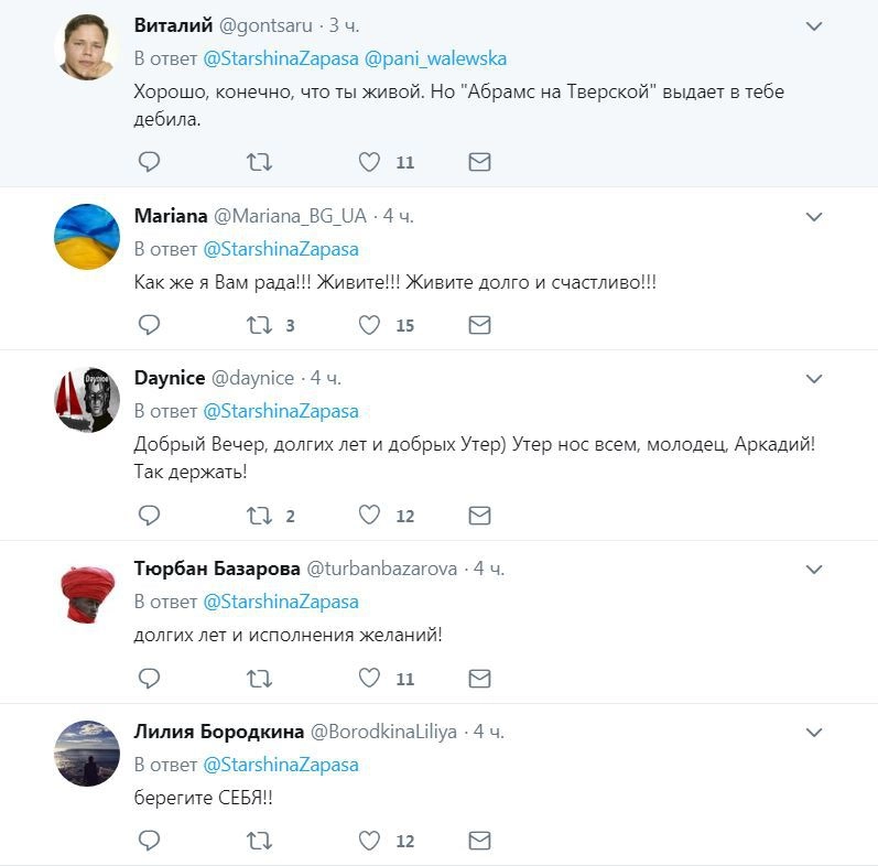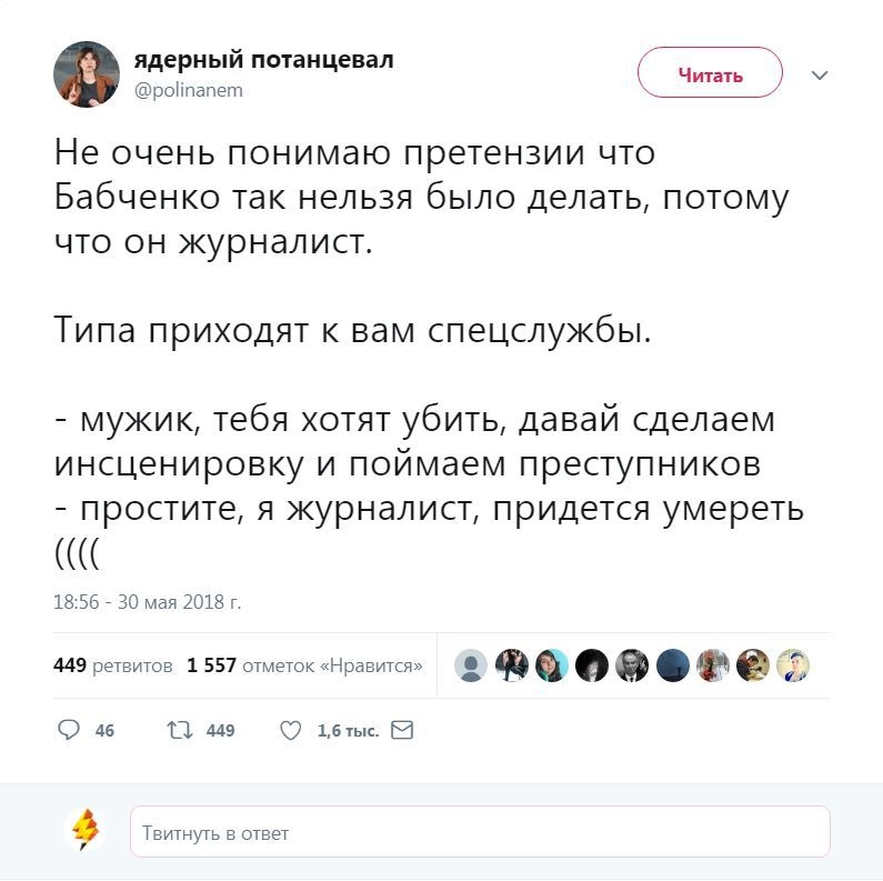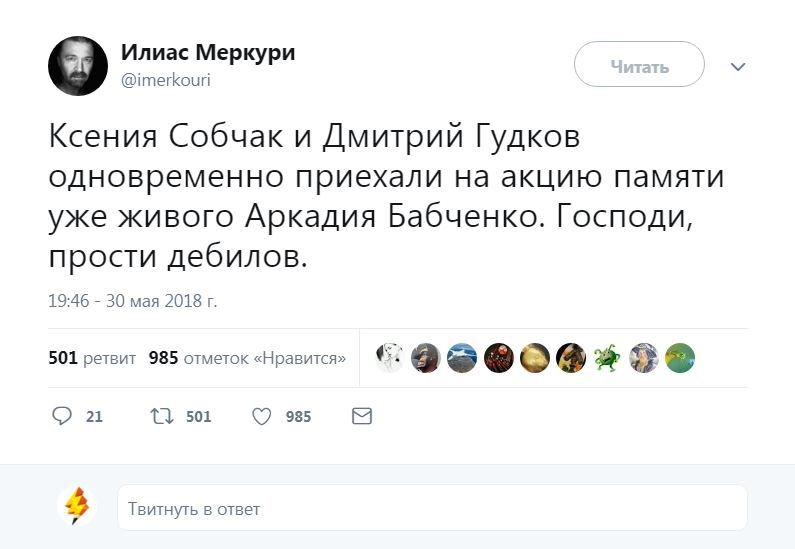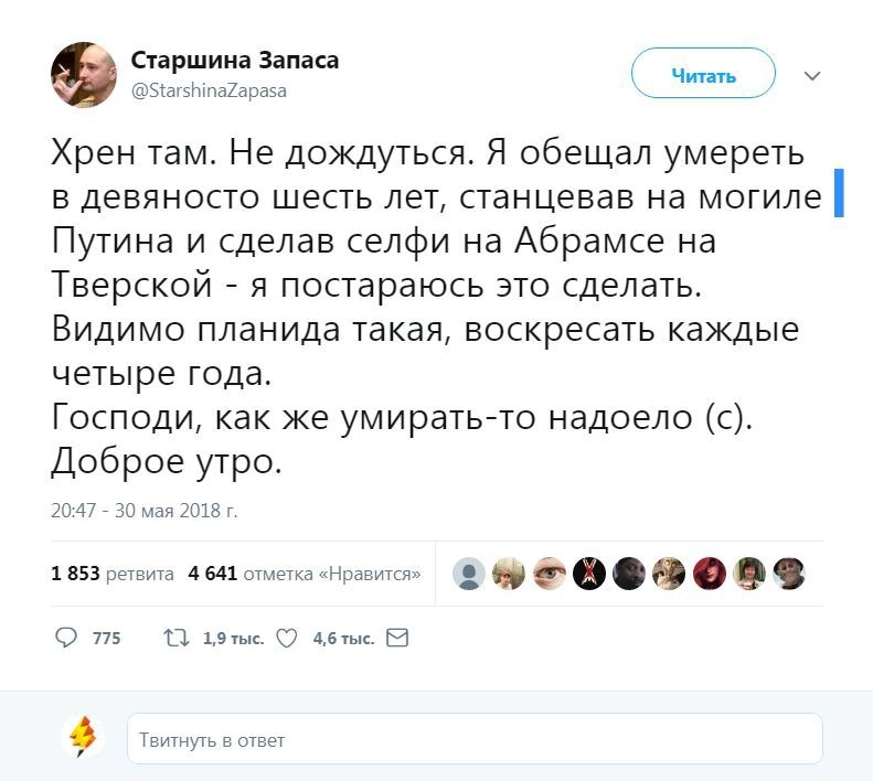 «Хрен там. Не дождутся. Я обещал умереть в девяносто шесть лет, станцевав на могиле Путина и сделав селфи на „Абрамсе“ на Тверской, — я постараюсь это сделать. Видимо, планида такая, воскресать каждые четыре года», — пообещал сам Аркадий Бабченко в своем Twitter.