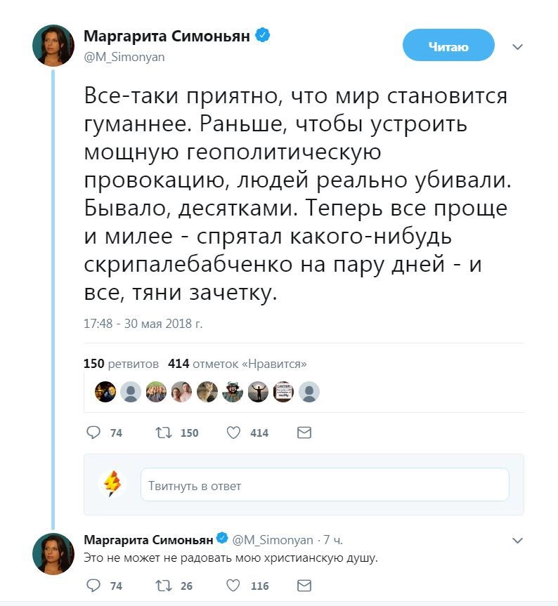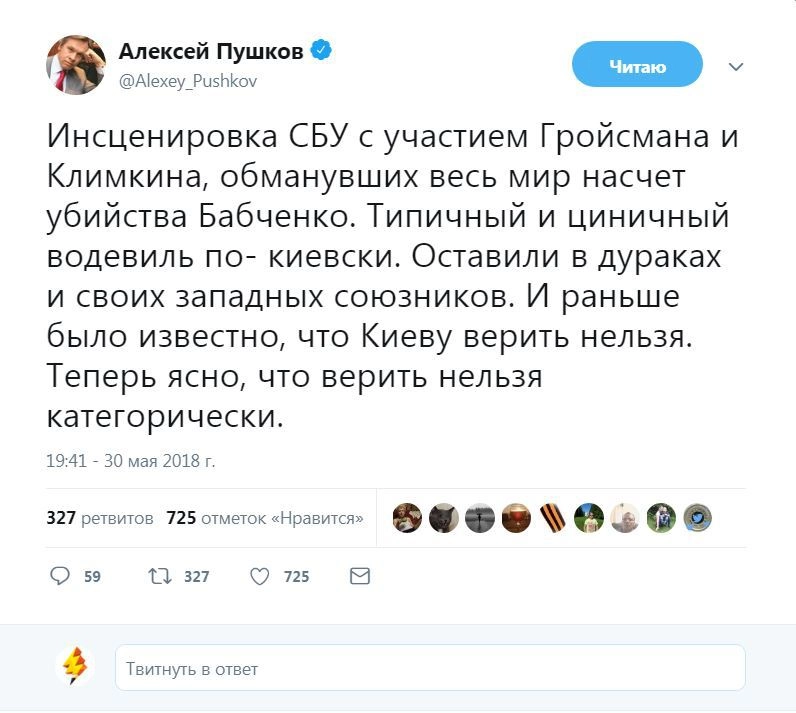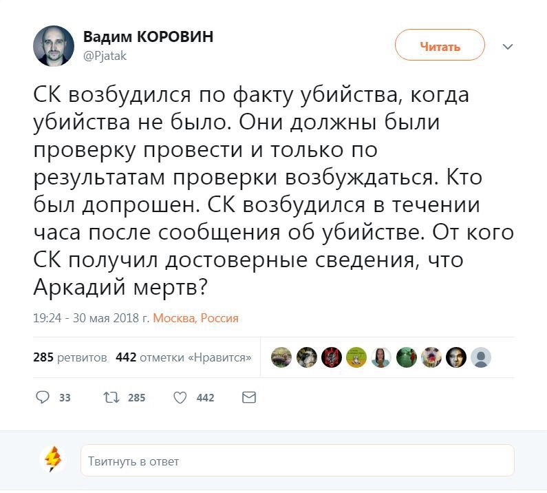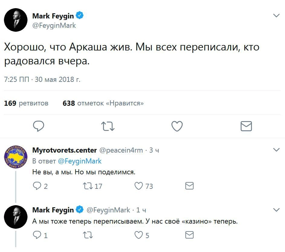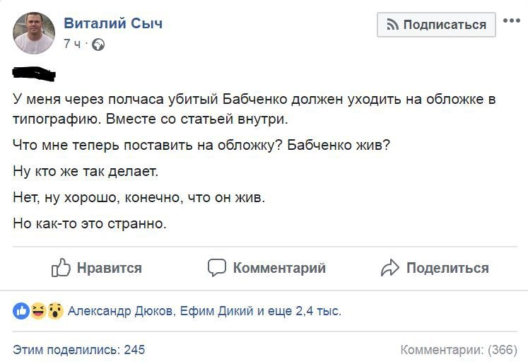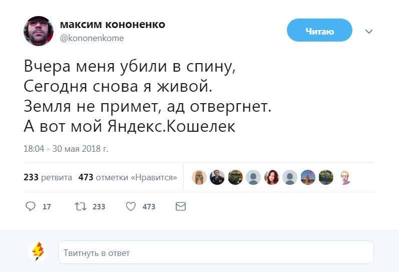 «Хрен там. Не дождутся. Я обещал умереть в девяносто шесть лет, станцевав на могиле Путина и сделав селфи на „Абрамсе“ на Тверской, — я постараюсь это сделать. Видимо, планида такая, воскресать каждые четыре года», — пообещал сам Аркадий Бабченко в своем Twitter.