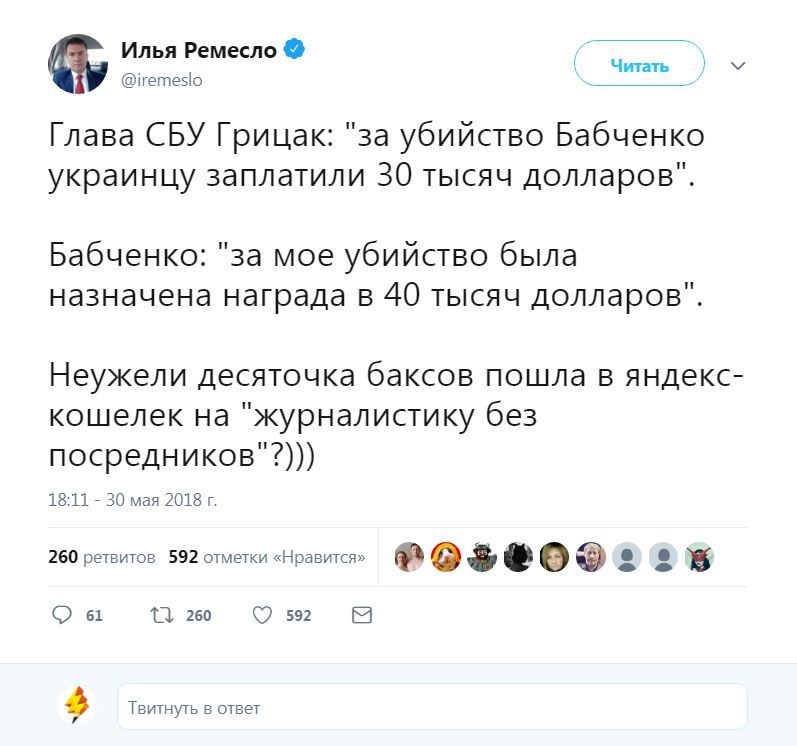 Депутат Верховной рады Антон Геращенко объявил, что это «представители российских спецслужб», в частности некий гражданин Украины, якобы воевавший в Донбассе и завербованный российской стороной. За совершение первого убийства, жертвой которого должен был стать Бабченко, ему обещали 30 тысяч долларов США и выдали аванс в размере 15 тысяч.