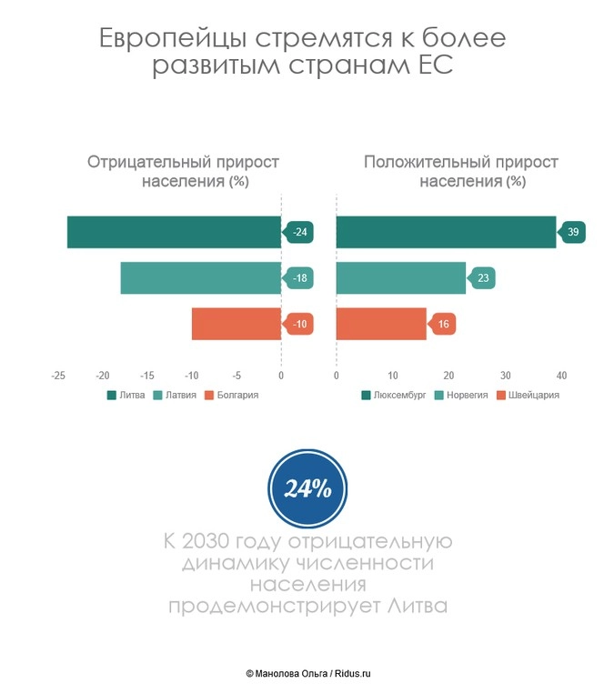 Ожидается, что отрицательную динамику численности населения продемонстрирует Литва (- 24%), Латвия (- 18%), Болгария (- 10%). Население Греции и Португалии через 15 лет сократится на восемь и шесть процентов соответственно, и этот процесс уже оказывает негативное влияние на экономики этих стран.