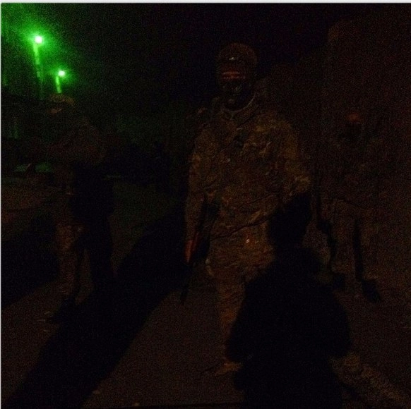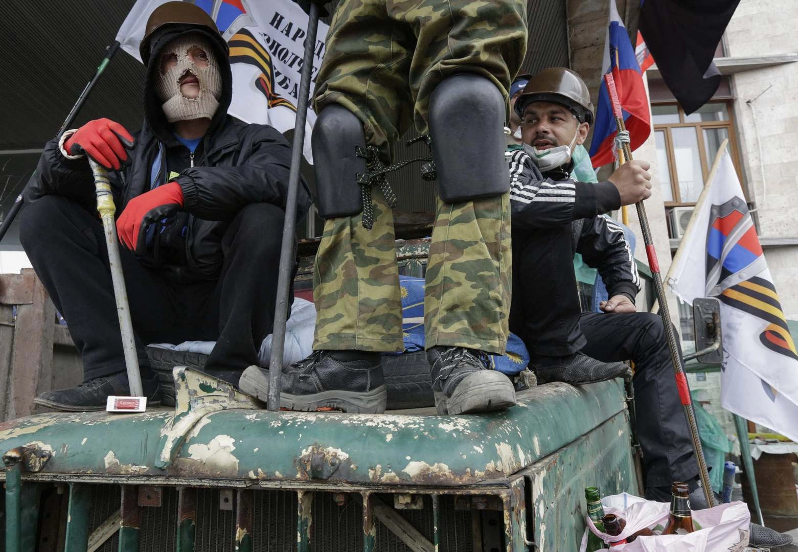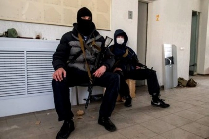 Фотографии неизвестных молчащих людей в военной форме в Донецке, которых пророссийские активисты считают «иностранными наемниками».