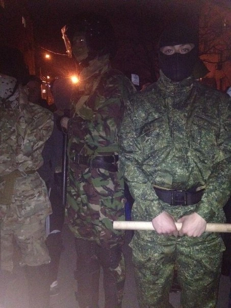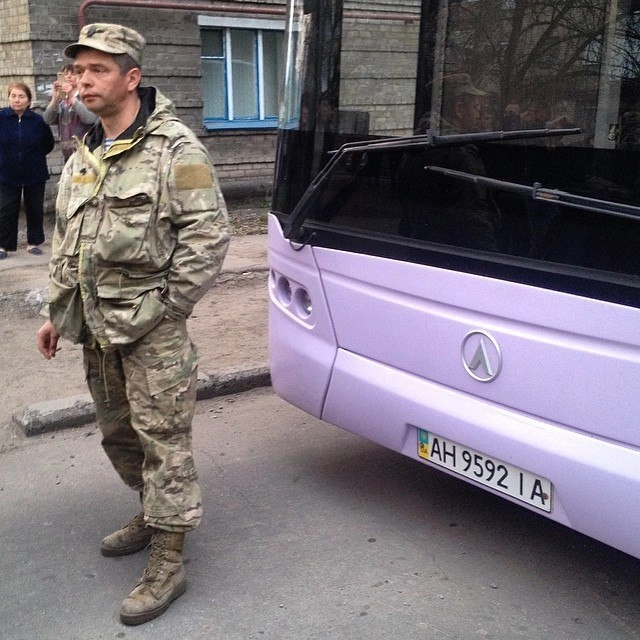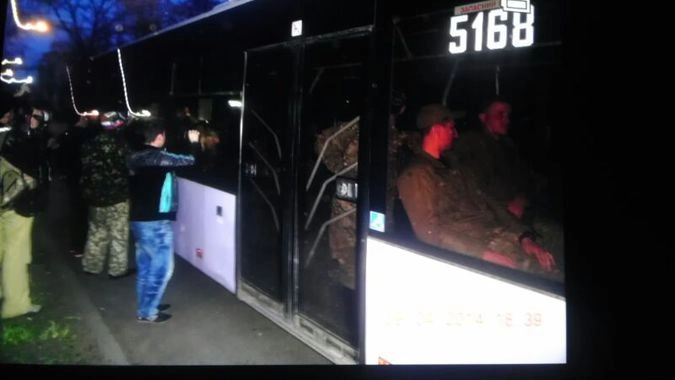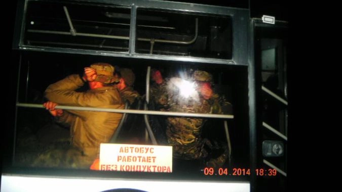 По сообщениям гражданского журналиста «Ридуса», ранее блокированные в Донецке автобусы с молчаливыми неизвестными в военной форме захвачены протестующими. Люди в военной форме зарубежного образца организованного переместились в здание военкомата Донецкой области.