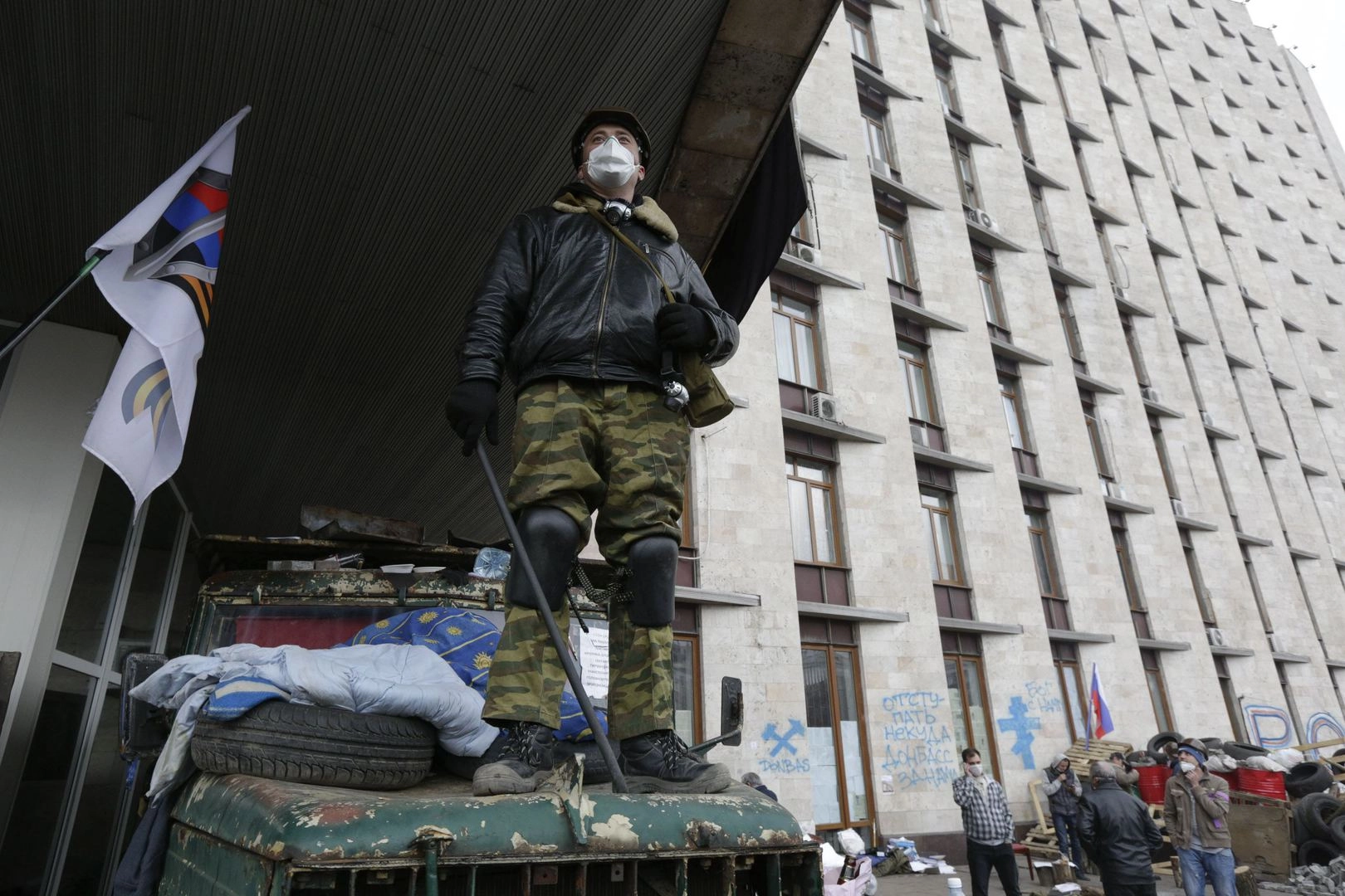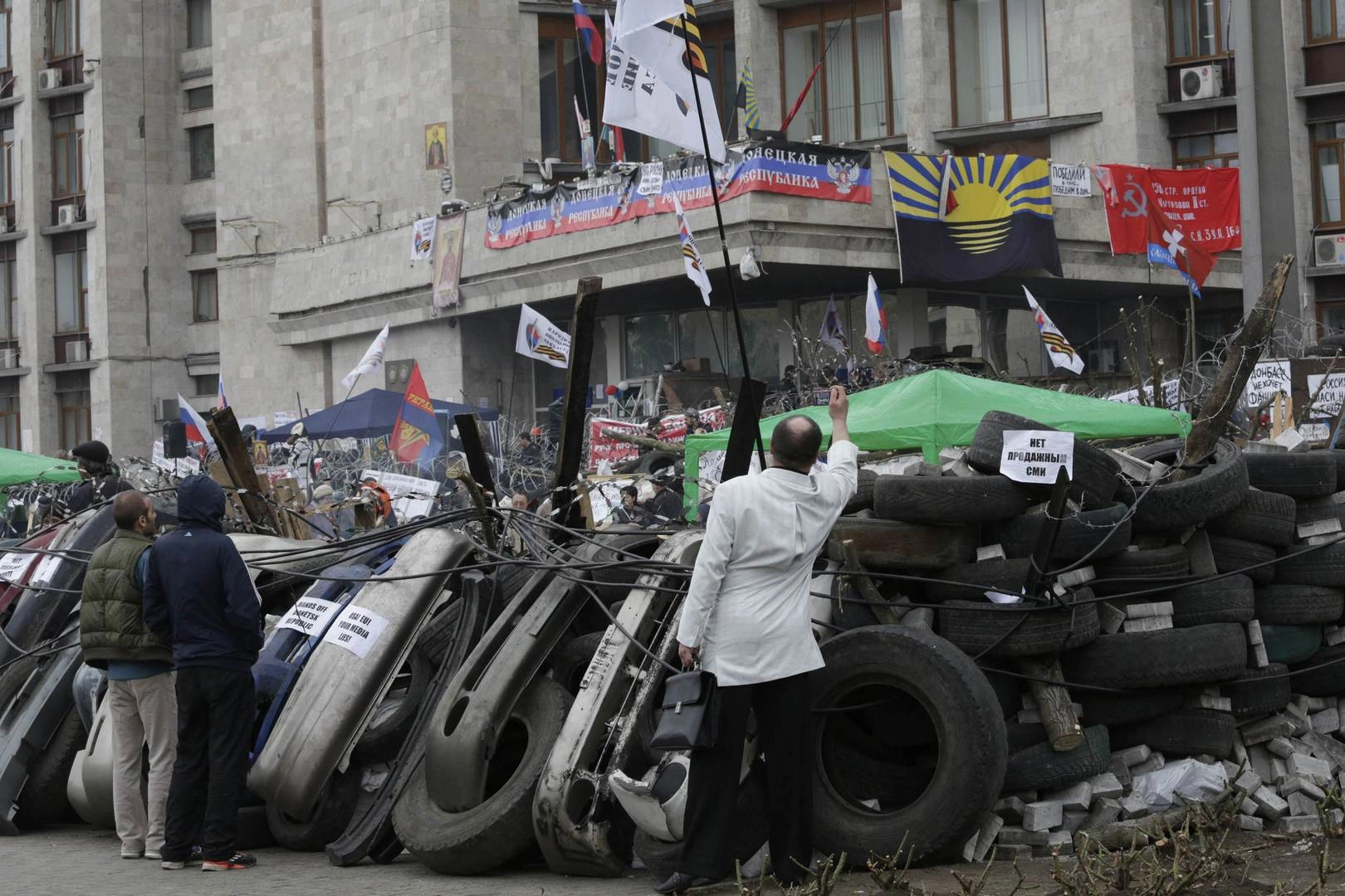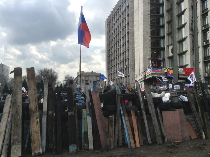 Баррикады вокруг здания областной госадминистрации, захваченного митингующими в Донецке.
