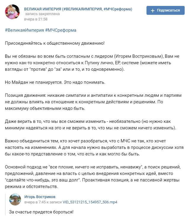 Там, в частности, обозначена позиция новоявленного движения. «Важно объединиться тем, кто хочет разобраться, что с МЧС не так, кто хочет настоять на изменениях. А для начала нужно выработать в процессе дискуссии хотя бы какое-то представление о том, что есть и как могло бы быть», — говорится на странице движения.