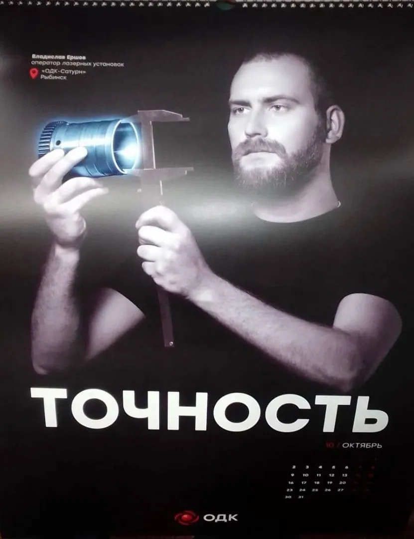Внимание остряков Рунета привлек лист календаря за октябрь с художественно обработанным снимком, символизирующим точность. На ней изображён замеряющий деталь штангенциркулем мужчина, который подписан как «Владислав Ершов, оператор лазерных установок».