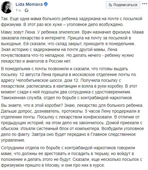 Еще одна мама больного ребенка задержана на почте с посылкой «Фризиума». В этот раз все хуже — уголовное дело возбуждено, — написала она.