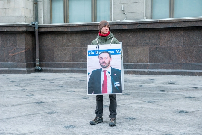 На гражданах, принимающих участие в акции, надеты двусторонние плакаты: на груди находится портрет депутата, а на спине – портрет оппозиционера Алексея Навального.